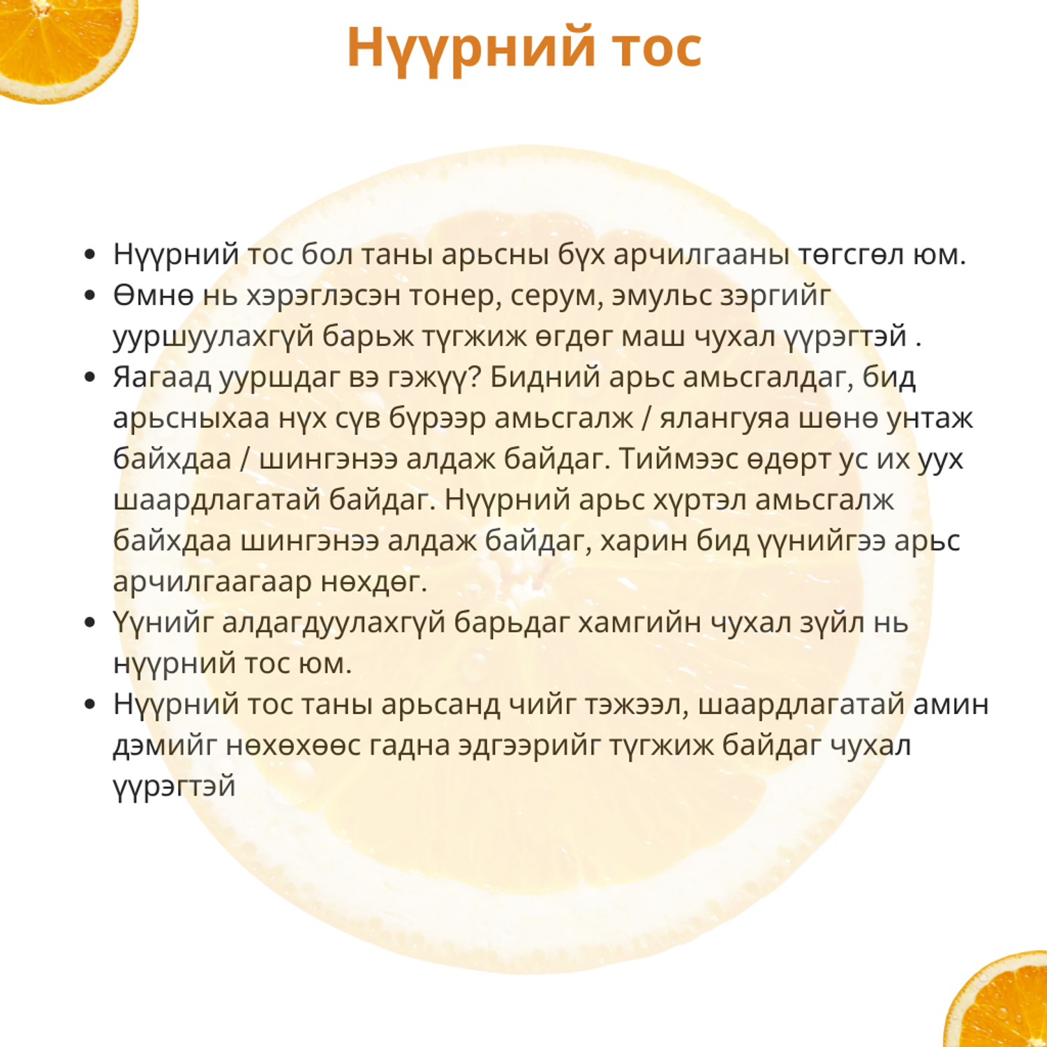 • Арьсны эвэрлэг давхаргыг сайн чийгшүүлж чийгшлийн алдагдлаас сэргийлнэ. Улмаар арьсны зөөлөн болон уян хатан байдлыг хадгалж өгнө